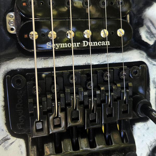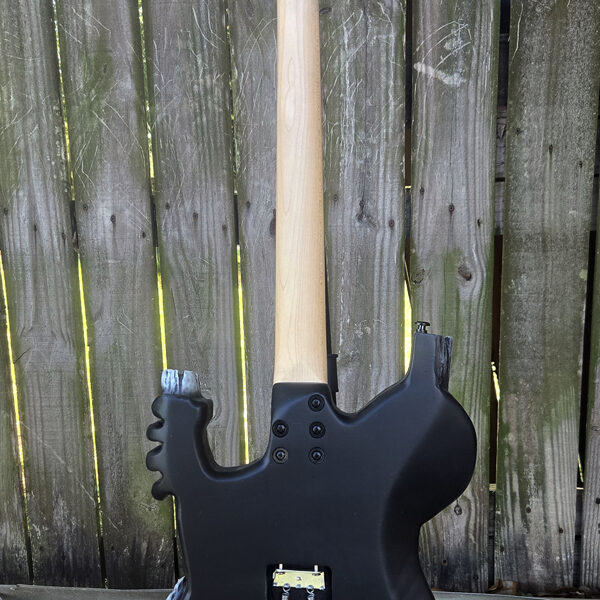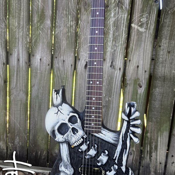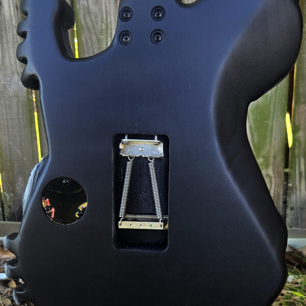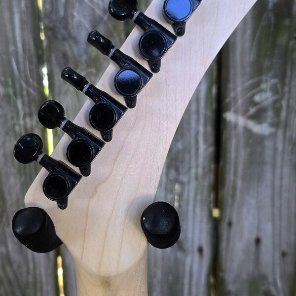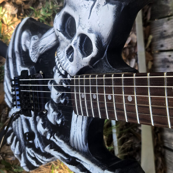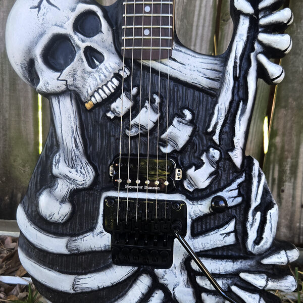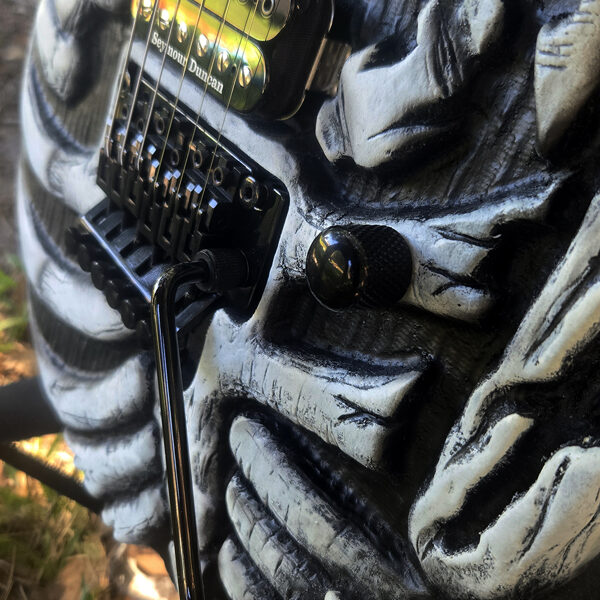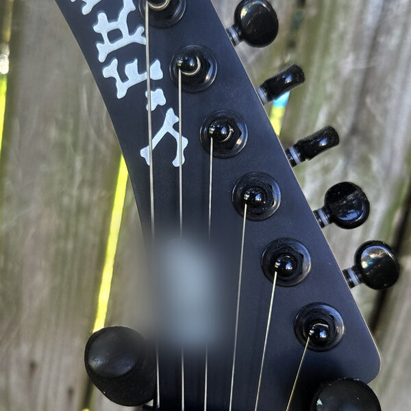 This is probably the last Skull N Bones we make this year! It has a carved Poplar body, reverse banana Holy Grail headstock, headstock adjust truss rod, super dark Rosewood fretboard, C neck shape, full floating Floyd Rose, George's Seymour Duncan Screamin Demon, and a hard case is included. ESP gets nasty if my guitars have an ESP logo on the headstock for trademark violations even if the description clearly states that it is NOT an ESP. That's cool. There must have been a smudge on my camera lens... ;D